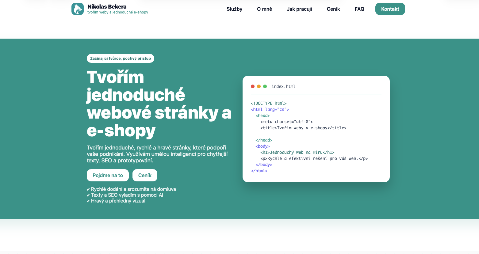 Tvořím jednoduché, rychlé a hravé stránky, které podpoří vaše podnikání. Využívám umělou inteligenci pro chytřejší texty, SEO a prototypování.